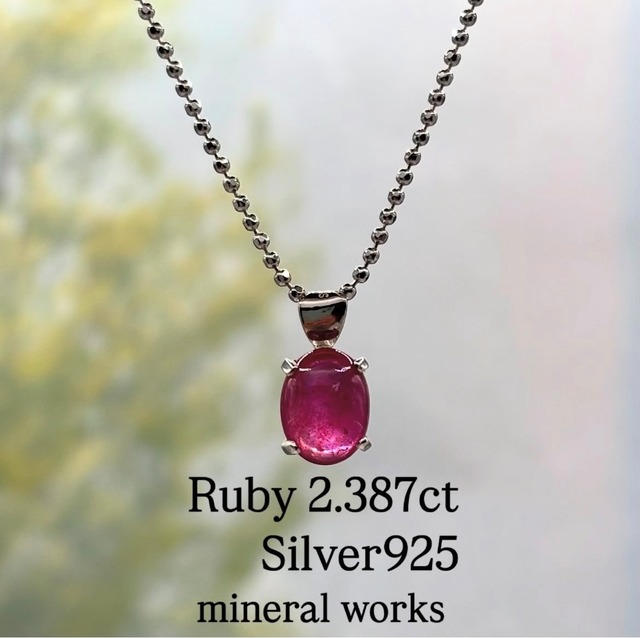 天然ルビー(含侵処理) 2.387ct NGLソーティング付き シルバー925ネックレス 47cm(アジャスター7cm含む) バチカン込長さ約12.4mm 横幅約6.3mm 厚さ約6.5mm 天然ルビーは内包物やひびが多く ガラス成分を含ませることで美しさを引き出す 含浸処理を施す事があります 見た目は天然の高価なルビーに近づけられますが、価格は非常にお手頃で気軽に楽しんでいただけるのが魅力です iPhoneを使用し 撮影しています